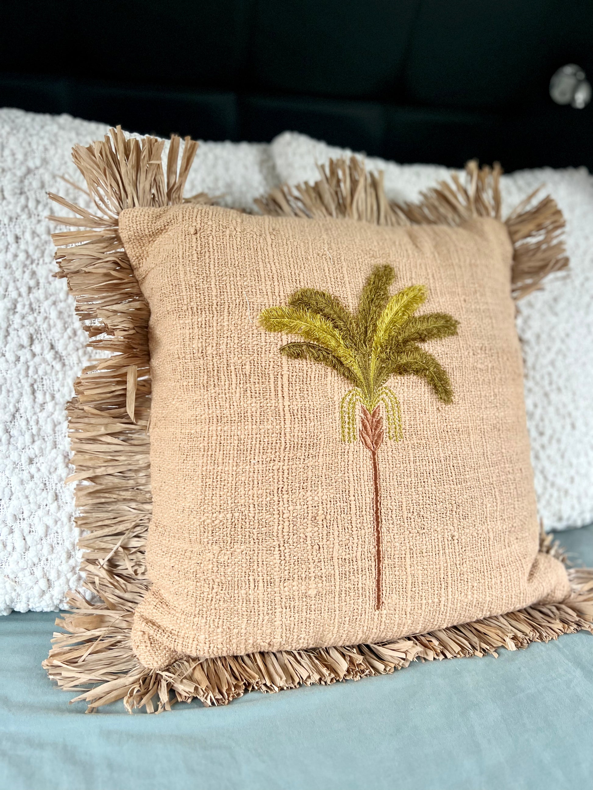 Pure Cotton Handmade Cushion Cover with a Silk Embroidered Palm Tree Detail, fully lined with a Sea Grass Fringe
