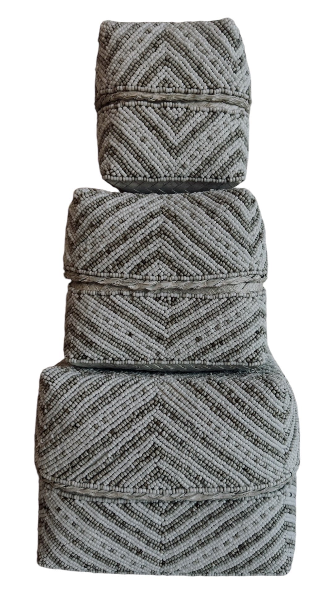 Handmade from Bamboo this matching set of 3 Boxes Embellished with Beige & White Beads …