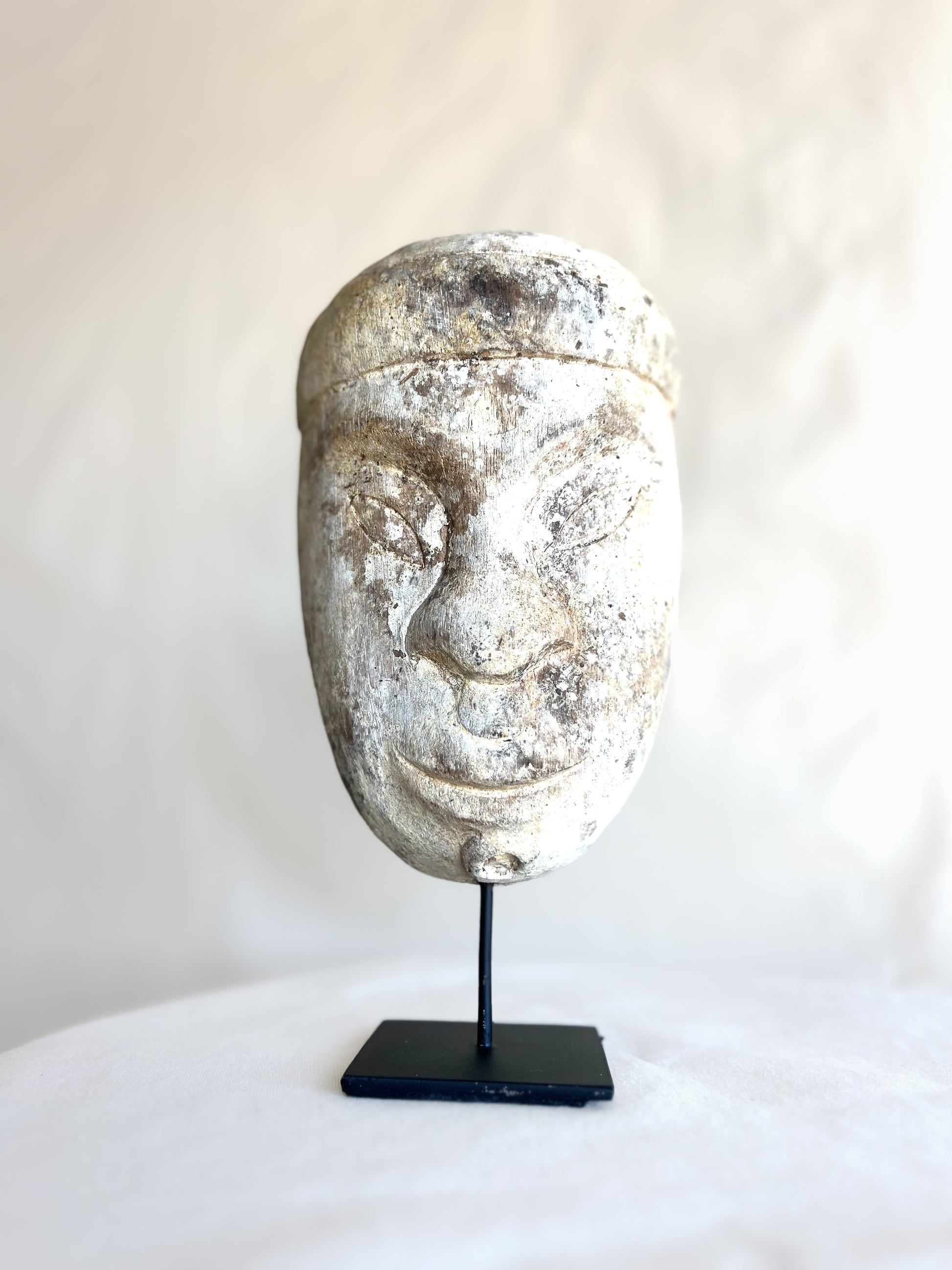 Java is a handcrafted face mask on a stand.