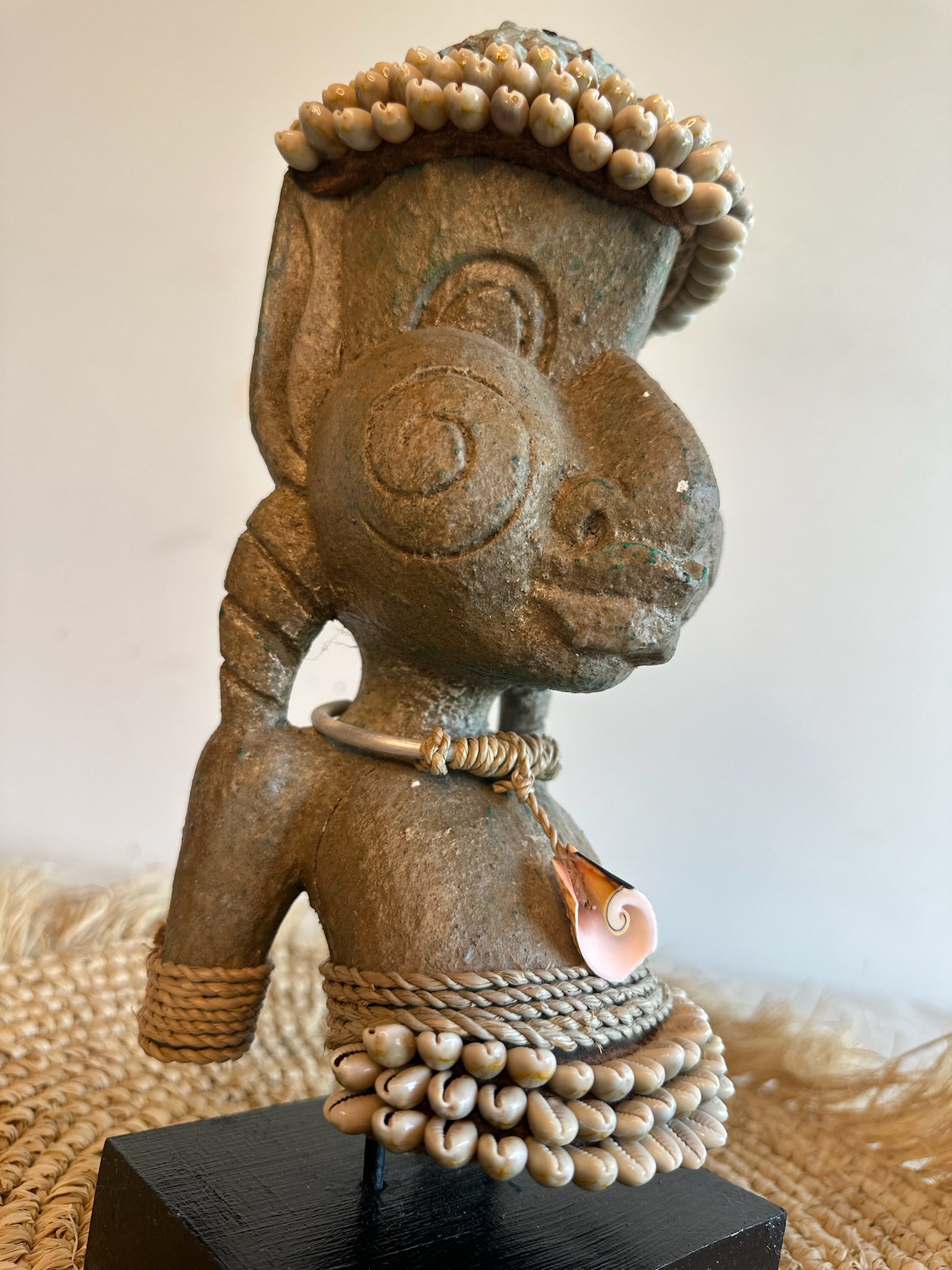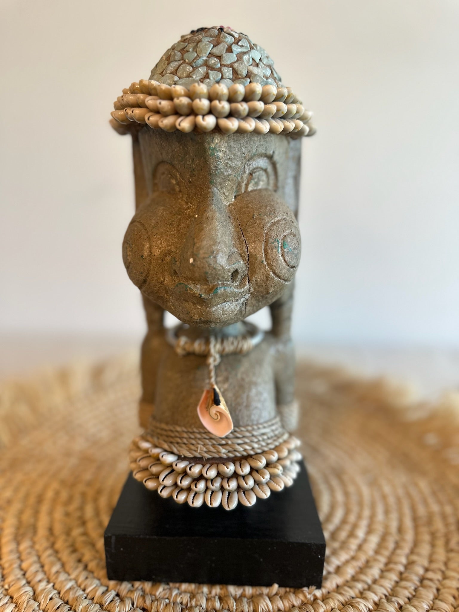 Tribal Sumba Statue featuring a Pebble Mosaic hat with cowrie shell brim